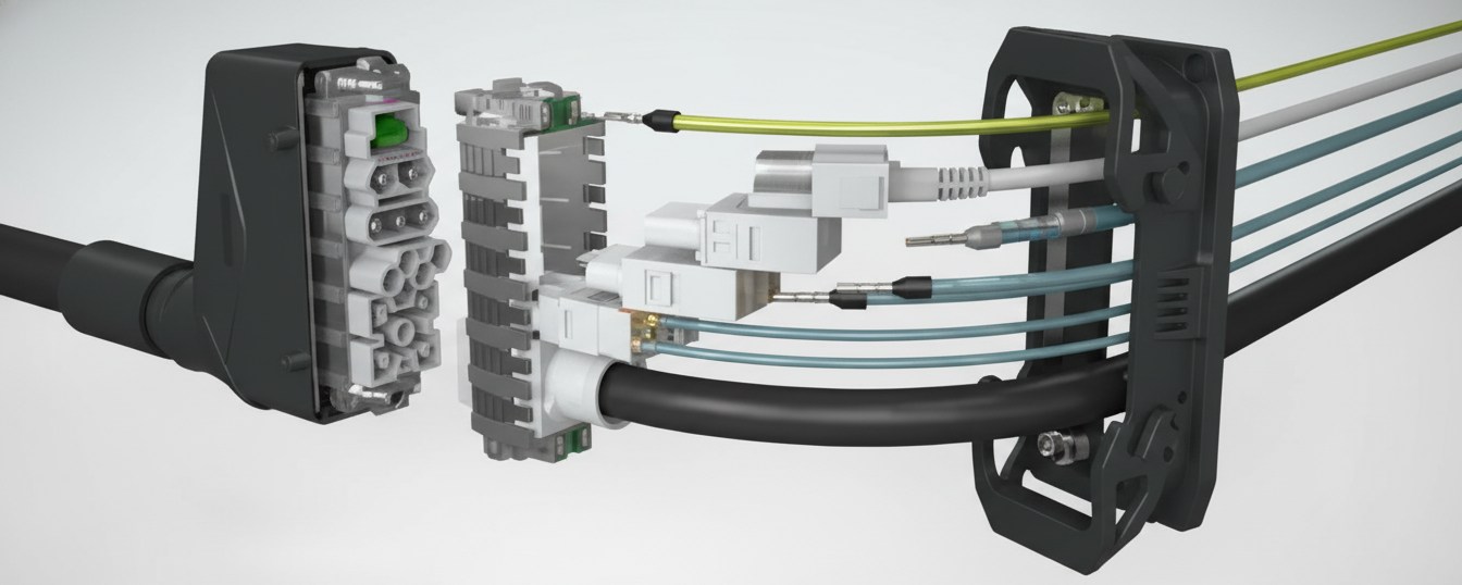 - Modular Design: Customise your connections with a flexible modular system. HEAVYCON allows you to combine contact inserts for power, data, signals, and pneumatics in a single compact housing, enabling space-saving, application-specific configurations.